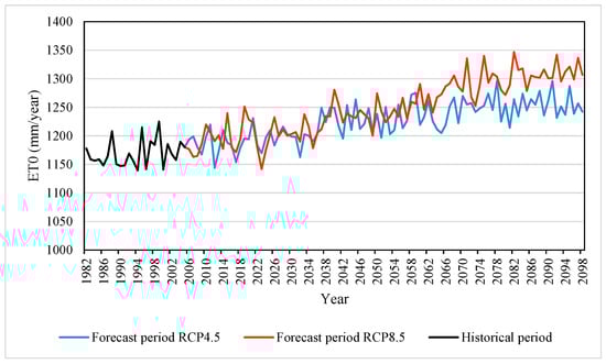The intersection of the two curves of annual ET0 (Figure 4), particularly during the period 2025–2049, was justified by the comparable Sen’s slope values under both RCP scenarios. Nevertheless, the period 2075–2098 exhibited the largest difference in terms of annual ET0 patterns, accentuated by the insignificant decline under the RCP4.5 scenario.