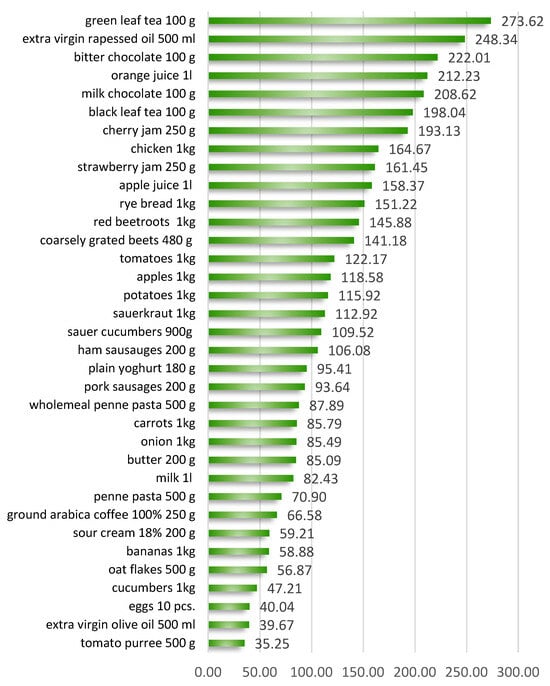 Throughout the investigated period, retail prices for organic food were higher than for conventional products. Extremely high price premiums (over 200%) were observed in green tea, rapeseed oil, bitter chocolate, and milk chocolate (Figure 1). They were very close to 200% for black tea and cherry jam. In the group with the lowest price premiums (lower than 100%), we found eggs, vegetables (cucumbers, onions, carrots), bananas, cereal products (pasta, oat flakes), tomato puree, dairy products (yogurt, milk, butter, sour cream) and, interestingly, coffee and thin dry pork sausages. Most of these products (apart from coffee and bananas) are grown and processed in Poland; therefore, their price is relatively lower. A reduction in price premium may be explicitly observed in the case of dairy products when compared with the previous research by Łuczka [36], in which the price premiums for dairy products were in the range between 130 and 255%. This fall in price is a result of the fact that big companies in the Polish conventional dairy market became involved in the processing of organic milk, which was followed by a decrease in the price of organic dairy products (previously imported to a large extent). Additionally, supermarket chains offer these products in this food category under their own private labels.