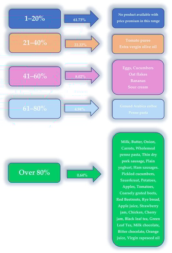 When comparing the declared consumer willingness to pay (WTP), considerable disproportions occur in the market between consumer price level acceptance and actual price premiums (Figure 2). Nearly 62% accepted prices not greater than 20%; however, none of the investigated organic food products were distinguished by the price premium in this range. In the range between 21 and 40% (suitable for 22% of the surveyed), there were two products only (tomato puree and olive oil). In the range between 41 and 60% (accepted by 8% of the surveyed), there were eggs, cucumbers, oat flakes, bananas, and sour cream, and in the following one (suitable for 5% of the respondents)—ground coffee and pasta. The vast majority of organic food products were in the range of over 80% accepted by less than 1%, which demonstrates that despite the awareness growth, consumer disposable income increase, organic market development, and moderate fall in price premiums, there are still huge disproportions between consumer WTP and the price level for organic food products on the Polish market. This clearly explains why the average Polish consumer spends about EUR 8 annually on organic food.