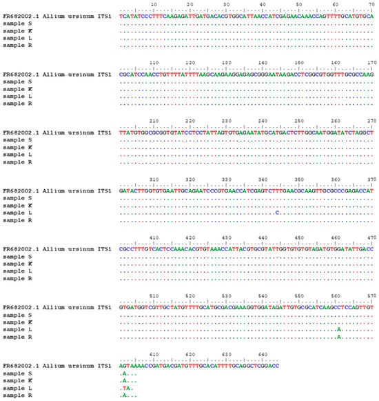 Primers for barcoding analyse were selected for their putative amplification of the DNA sequences that codify for small- (18S, SSU) and large-subunit (28S, LSU) ribosomal RNA (rRNA). The primers were selected for their previous use; they are considered standard primers for amplifying these regions in various species of fungi and higher plants [36,61]. According to many authors, thanks to their variability, ITS regions yielded sufficient molecular information, which can be directly used as identifiers or molecular markers in the phylogenetic analysis [61,62,63]. In our case, the ITS product was variable in some nucleotide positions when compared to the ITS sequence of Allium ursinum stored in the NCBI database (Figure 1). For comparison purposes, registered NCBI database sequences were used, and their sequences were compared with the BLAST algorithm.