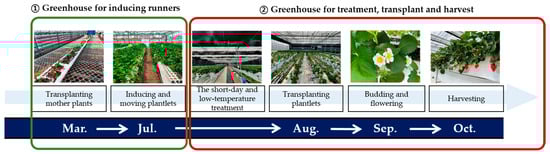 The short-day and low-temperature treatment at the nursery stage began by moving plantlets from the nursery greenhouse to the environmental treatment greenhouse on three treatment dates: 4 July, 14 July, and 25 July. They were transplanted in the same greenhouse about 5 weeks after treatment. The control group was transplanted on 15 September without environmental treatment. The temperature and photoperiod treatment involved using blackout curtains and ventilation ducts. The photoperiod treatment consisted of 8 h of daylight and 16 h of darkness: at 5 PM, the blackout curtains were lowered, and cooling was initiated; at 9 AM, the curtains were raised. The daytime temperatures did not exceed 35 °C and nighttime temperatures did not drop below 18 °C. The greenhouse door was covered with a black polyethylene film, and shade (OBSCURA, AB Ludvig Svensson, Kinna, Sweden), side, and front curtains (Yuk-il Agro Spun Curtain Co., Seongju, Republic of Korea) were used to create a blackout environment. Transplanting dates varied according to the short-day and low-temperature treatment period. The plantlets in the 4 July treatment were transplanted on 11 August, with the short-day and low-temperature treatment period lasting from 4 July to 11 August; those in the 14 July treatment were transplanted on 18 August, with the short-day and low-temperature treatment period lasting from 14 July to 18 August; and those in the 25 July treatment were transplanted on 25 August, with the short-day and low-temperature treatment period lasting from 25 July to 25 August. The experiment started on 8 March 2022 with the transplantation of the mother plant and concluded on 25 July 2023 with the end of the harvest (Table 1 and Figure 1).