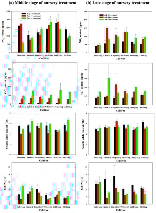 NO3− content, Ca2+ content, soluble solids content (SSC), and SSC/NO3− of six strawberry cultivars in the nursery period affected by the short-day and low-temperature treatment (three treatment start dates: 4 July, 14 July, and 25 July) during the middle stage ((a), approximately 20 d after the short-day and low-temperature treatment) and late stage ((b), approximately 35 d after the short-day and low-temperature treatment). Vertical bars indicate standard errors of the means (n = 15).
