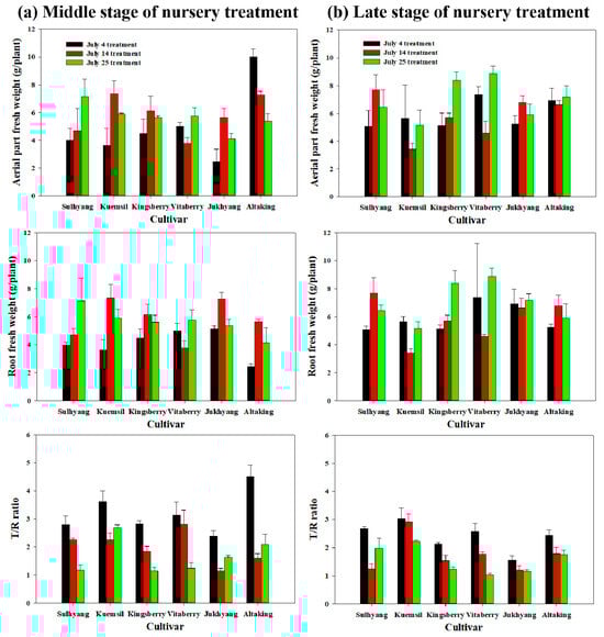 Furthermore, we investigated the aerial and root fresh weight of the plantlets according to the treatment date and calculated the ratio of aerial to root part biomass (T/R) (Figure 3). Greater root weight indicates superior root development, which is a significant factor determining the yield of plantlets [1]. In the present study, the T/R ratio tended to decrease in the late-nursery stage compared to that in the mid-nursery stage, indicating increased root growth in the plantlets. The decline in the T/R ratio was most pronounced in the 4 July treatment, where the T/R ratio in the late-nursery stage was reduced by 46% in ‘Altaking’, 35% in ‘Jukhyang’, 25% in ‘Kingsberry’, 18% in ‘Vitaberry’, 16% in ‘Kuemsil’, and 4% in ‘Sulhyang’ compared to that in the mid-nursery stage. This indicates that vigorous root development occurred in plantlets in the 4 July treatment.