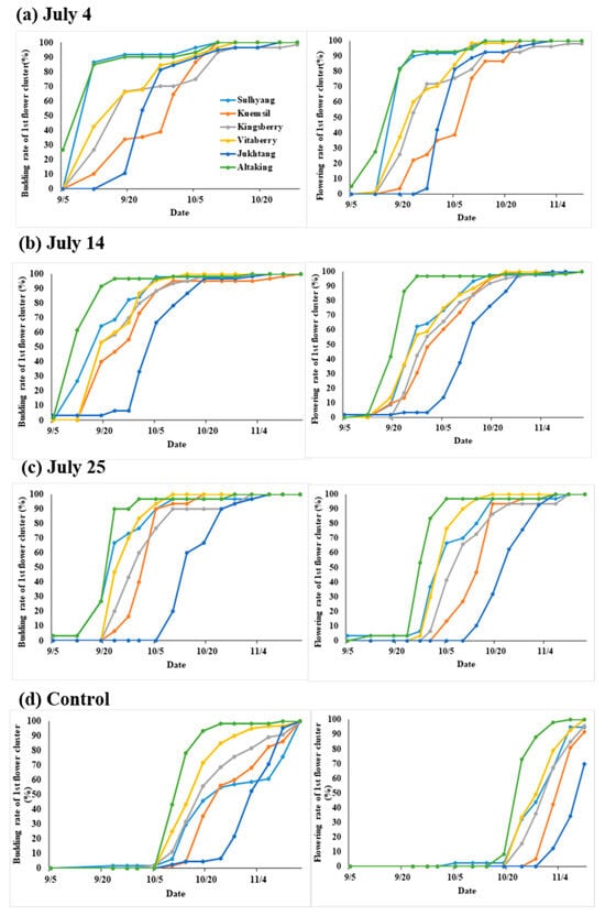 Changes in the budding and flowering rates of six strawberry cultivars in the first flower cluster affected by the short-day and low-temperature treatment (three treatment start dates: 4 July, 14 July, and 25 July) and the control.