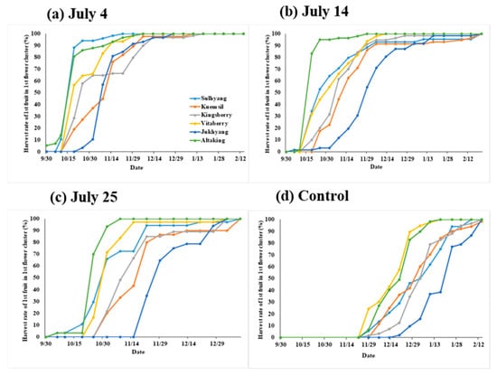Changes in the first fruit harvest rate of six strawberry cultivars in the first flower cluster affected by the short-day and low-temperature treatment (three treatment start dates: 4 July, 14 July, and 25 July) and control.