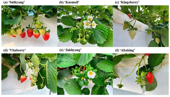 The experiment was conducted in two greenhouses located at the National Institute of Horticultural and Herbal Science in Wanju-gun, Jeollabuk-do. Pots (multi-cup type D, Hwasung Industrial Co., Ltd., Jinju, Republic of Korea) for transplanting the mother plants were placed in a double-span plastic greenhouse and filled with horticultural strawberry substrates using a mixture of coir, peat, and pearlite (Hanareum type A, Sinsung Mineral, Seongnam, Republic of Korea). On 8 March 2022, the mother plants of six strawberry cultivars (Fragaria × ananassa Duch. ‘Sulhyang’, ‘Kuemsil’, ‘Kingsberry’, ‘Vitaberry’, ‘Jukhyang’, and ‘Altaking’) were transplanted, and runners were induced in 24-cell pots (510 mm × 340 mm × 100 mm, 168 mL/cell, Hwasung Industrial Co., Ltd., Jinju, Republic of Korea). Depending on the treatment date, the plantlets were moved to a single-span plastic greenhouse (width 28 m, height 14 m, length 32 m) for the short-day and low-temperature treatments, followed by transplanting.
