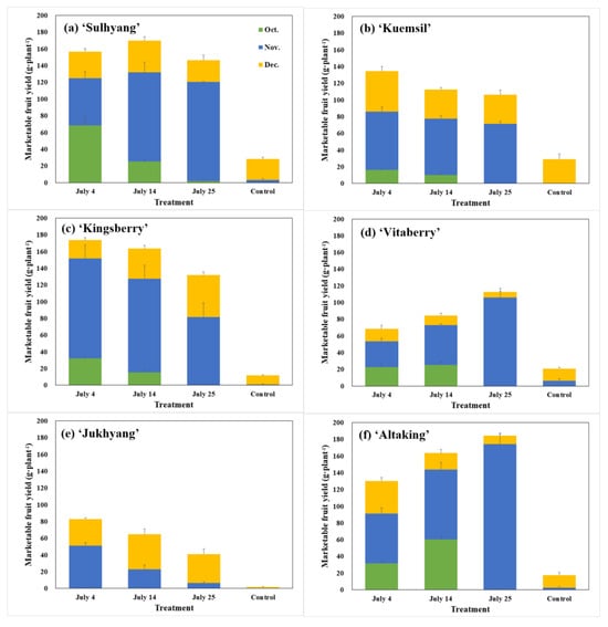 Marketable fruit yield of six strawberry cultivars from October to December based on the date of the short-day and low-temperature treatment (three treatment start dates: 4 July, 14 July, and 25 July) and the control. Vertical bars indicate standard errors of the means (n = 3).
