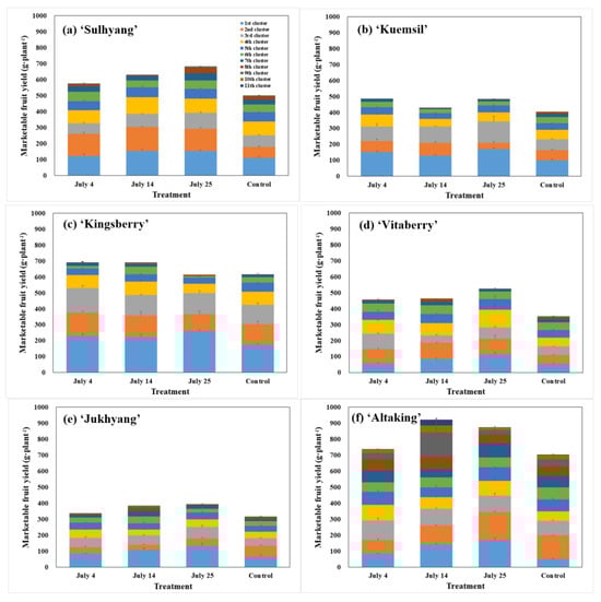 Furthermore, the yield of each flowering cluster was investigated (Figure 8), and the results showed that for the ‘Sulhyang’ cultivar, the yield per each flower cluster increased in all flower clusters after the nursery treatment compared to the control group. ‘Kuemsil’ showed a high overall yield in the 4 July and 25 July treatments, especially in the former, where it had a relatively uniform fruit production without significant variation after the sixth flower cluster and was 20% higher in yield compared to the control group transplanted on 15 September. In the 4 July and 14 July treatments, the yield of ‘Kingsberry’ was 11% higher than that of the control group transplanted on 15 September. Transplanting on 11 August after the short-day and low-temperature treatment on 4 July is deemed effective for enhancing income, as the initial yield in the first to fifth flower clusters was high, leading to an increase in strawberry price. In the 25 July treatment, ‘Vitaberry’ showed the highest total marketable yield per plant at 526.2 g, but consistent development was observed in the later flower clusters when treated on 4 July and 14 July. When treated with the short-day and low-temperature treatment during the nursery stage, ‘Jukhyang’ exhibited significantly higher yield in the first flower cluster compared to the control group. This is expected to contribute to income enhancement for farmers. ‘Altaking’ had the highest yield in the 14 July treatment (921.5 g/plant) and consistently showed a high yield from the beginning to the late yield, resulting in a 31% higher yield compared to that of the control group. This was consistent with the findings of previous research showing an increase in yield and marketable fruit ratio in short-day and low-temperature treatments compared to those in the control [27].