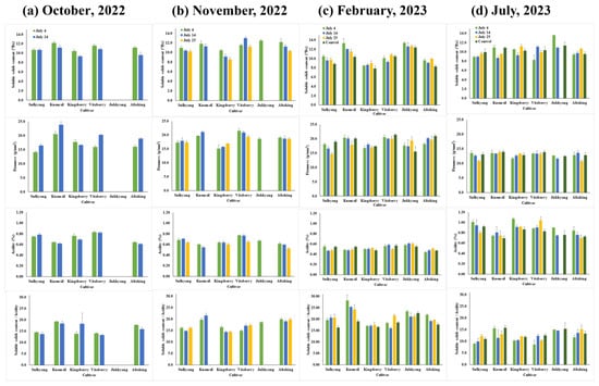 Fruit quality characteristics of six strawberry cultivars affected by the short-day and low-temperature treatment (three treatment start dates: 4 July, 14 July, and 25 July) and the control (investigation date: (a), October 2022; (b), November 2022; (c), February 2023; (d), July 2023). Vertical bars indicate standard errors of the means (n = 15).