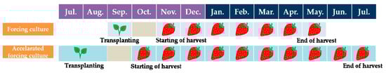 Strawberries in Korea are predominantly cultivated through forcing culture, a method of transplanting in mid-September after the differentiation of the first flower cluster and greenhouse film covering and insulation in mid- to late-September before entering dormancy in October [1]. Most Korean strawberries are harvested starting late November, resulting in a high unit price of around KRW 33,136 (USD 25.2) per kg in October and KRW 25,041 (USD 19.0) per kg in November, gradually decreasing to KRW 17,181 (USD 13.1) per kg in December when the full-scale harvest of accelerated forcing culture strawberries begins. The period from October to November experiences minimal strawberry production. Following a peak in prices, the unit price drops to KRW 8823–9032 (USD 6.7–6.9) per kg in March when a large quantity of strawberries with low marketability is supplied [2].