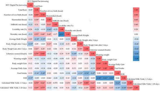 Correlations of backfat thickness in sow reproductive performance, calculated milk yield, and piglet growth performance. Legend: Red colors signify a positive correlation between variables, whereas blue colors denote a negative correlation. The intensity of the color reflects the strength of the correlation coefficients, whether positive or negative; * Significantly different (p < 0.05).