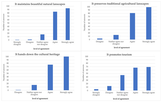 The participants of the survey showed a highly positive perception of the role played by extensive rearing of Podolian cattle on the landscape and territory for keeping local culture and traditions, thus promoting the development and preservation of marginal areas. In a study conducted in the French territory, nearly all the respondents stated that landscapes shaped by agricultural activities involving livestock could be considered “cultural” as they unquestionably play a significant role in shaping the unique identity of each region [