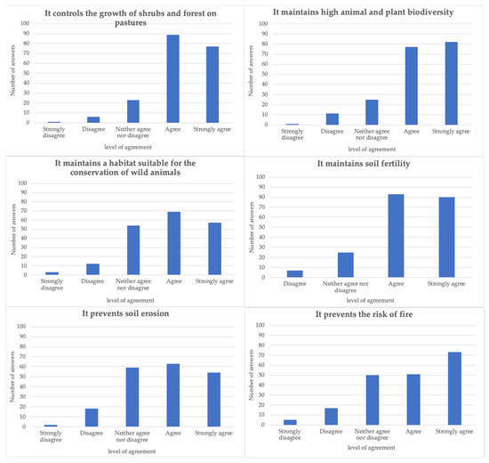 66]. The findings on the perception of the polluting effects of Podolian livestock are more controversial. The perception of the role of this livestock system in the emission of greenhouse gases and water and soil pollution highlights how people often equate it with intensive farming. Similar findings have also been observed by [