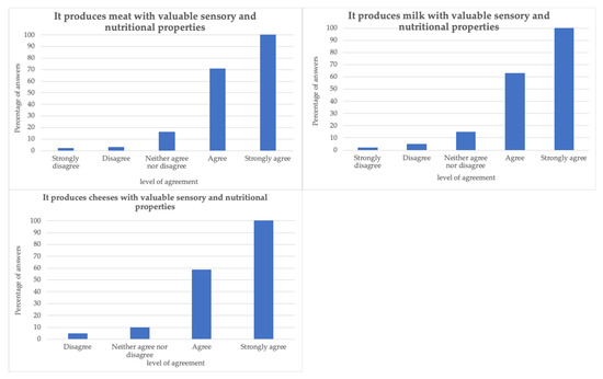 As for provisioning ESs, in this study, most of the respondents perceived dairy and beef provided by the Podolian system to have high nutritional and sensory properties. Sensory properties, such as the appearance, odor, flavor, taste, and texture of foods detectable by human senses, are particularly important to characterize the peculiarities of typical products. Recent studies stated that the traditional Caciocavallo Podolico cheese-making protocol is the strategy to harmonize the microbial evolution and to almost constantly maintain the final characteristics of this cheese [