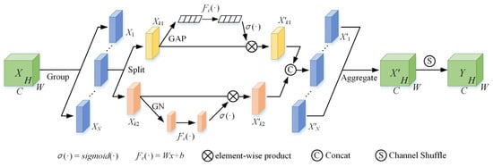 Xk2 is used to form a spatial feature map. Subsequently, the two branches are concatenated, the sub-features are aggregated, and the cross-group information communication is realized through the channel shuffle operation. Finally, the refined output feature map