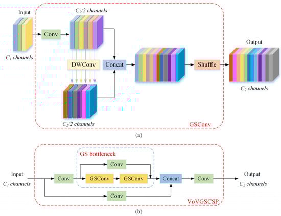 Figure 10a schematically illustrates the structure of GSConv. GSConv combines the information generated by depthwise separable convolution (DWConv) and standard convolution. Then, it uses the shuffle operation to exchange information between different channels and subsequently acquires the output results. GSConv fully combines the advantages of the two kinds of convolution and enhances the expression ability of the network. It not only effectively reduces the computational complexity but also promotes the balance between the model’s accuracy and speed [
