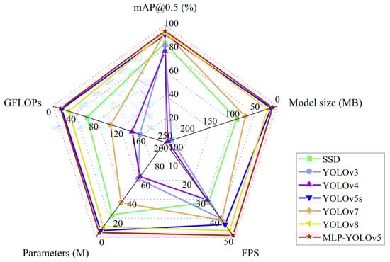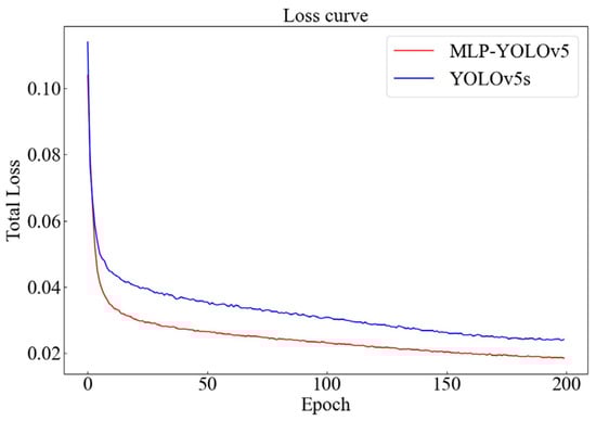 The computing platform used in this study was a laptop (T58-V37, Machinist, Suzhou, China). The hardware configurations include an 8-core AMD Ryzen 9 5900 HX CPU, 32 GB RAM, NVIDIA GeForce RTX 3070 (8 GB) GPU, and 1 TB SSD. The software configurations include the Windows 11 operating system, the PyTorch 1.12.1 deep learning framework (with the CUDA version of 11.6 and the cuDNN version of 8.0), and the Python 3.7 programming language. The basic training parameters of the MLP-YOLOv5 model include: the maximum number of training epochs was 200; the image input size was 640 × 640; the batch size was set to 16; the momentum was set to 0.937; the initial learning rate was set to 0.01, and the optimizer used was SGD.