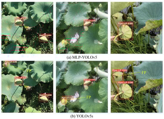 In terms of detection accuracy, MLP-YOLOV5 achieved a mAP of 94.9% by adopting measures such as adjusting the multi-scale detection layer, optimizing anchor box parameters, and introducing the transformer encoder block and SA attention mechanism. Compared with the baseline model, the precision and recall rates for small-scale lotus pods were increased by 5.5% and 7.4%, respectively. Similar research has been reported in other literature. Reference [