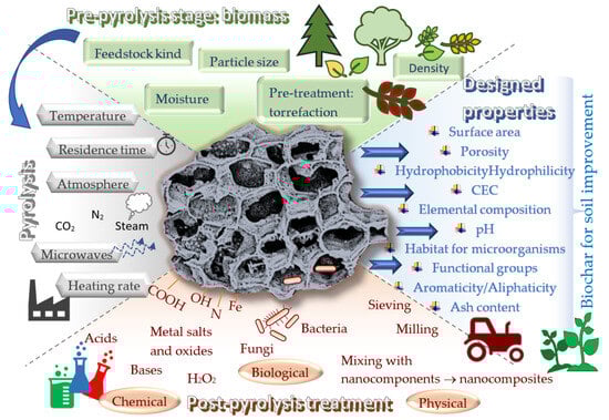 Depending on the type of process and the kind of materials used, the physical, chemical, and biological methods can be roughly distinguished in the technology of biochar engineering []. Another more detailed division underlies modification techniques and moments of decisions and actions aimed at obtaining a product with desired characteristics. Considering this second division, the first type of modifications can be performed at the pre-pyrolysis stage. It covers a selection of optimal kinds of feedstock and their moisture, density, or particle size. The second type of modification concerns the control of pyrolysis parameters, i.e., residence time, pyrolysis temperature, heating rate, pressure, and type of carrier gas or catalyst. The third extremely promising group is post-pyrolysis processing. These processes are still undergoing dynamic development and include both relatively simple methods, such as acid/alkali treatment or physical activation [], but also more complex ones, such as microbial engineering or modifications with nano-particles. Figure 1 shows the biochar modification strategies considering the above criteria.