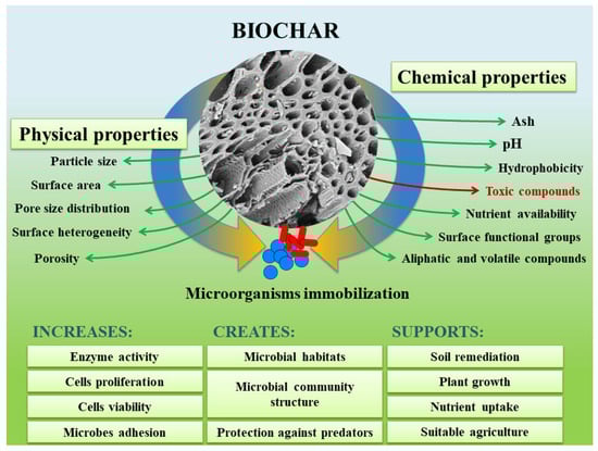 Figure 3 summarizes the physicochemical properties of biochar affecting the immobilization of microorganisms in the biochar matrix.