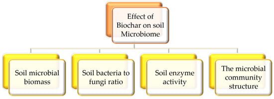 Soil microorganisms are key indicators of soil quality since they participate in many biochemical processes essential for soil functioning []. Therefore, it is important to elucidate changes in soil microbial communities that are caused by soil management practices such as biochar applications []. Changes in soil conditions accompanying different biochar application rates have a significant impact on microbial activity in the soil and on changes in the community structure [,]. The response to a biochar addition in soil can be revealed by activity, diversity, and soil microbial community abundance, which, in turn, can cause positive outcomes such as the facilitation of biochemical cycling, enhancement of the activity of soil enzymes, improvement of soil structure through microaggregates, contaminant degradation (transformation into less toxic forms by oxidation, reduction, and hydrolysis) or immobilization (sorption into cells, formation of complexes/precipitates), and promotion of plant growth []. However, according to Pathy et al. [] and Gomez et al. [], the exact mechanism by which biochar affects the microbial population is not precisely known yet. They suggested that changes in microbial functions and community structure are only possible when biochar application rates are high enough to significantly alter soil moisture retention capacity, pH conditions, and nutrient concentrations. Nevertheless, the accepted opinion is that there are several microbiological properties that are sensitive to biochar addition. They are usually used as indicators for assessing the impact of biochar in soil, and they are presented in Figure 4.