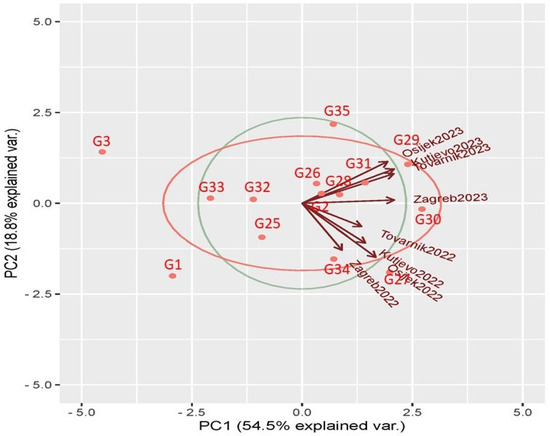 By combining two growing seasons and four locations, the PCA biplot showed that 54.5% of the total variability for grain yield was explained by the first principal component (PC1) and 18.8% by the second principal component (PC2) (Figure 1). The first two principal components (PCs) together explained 73.3% of the total variability. As can be seen from the biplot, locations in the 2022/2023 growing season were grouped on the upper right side, while locations in 2021/2022 were grouped on the lower right side of the PCA plot. At the same time, the positioning of the genotypes showed that genotype 29 was grouped near location vectors in 2022/2023 (Osijek, Tovarnik, and Kutjevo) and genotype 30 near Zagreb, which could be classified as high yielding in most of the locations. Genotype 21 was shifted toward the location vectors Kutjevo and Osijek in 2021/2022. Furthermore, genotype 34 was near Zagreb in 2021/2022 and was positioned further to the lower right side of the PCA plot. Accordingly, the highest contribution to factor 1 was from genotypes 3, 1, 30, 29, and 33 (Figure 1; Table S3). The very high contribution to factor 2 was from genotypes 35, 1, 27, 34, and 3. The lowest contribution to both factors 1 and 2 was from genotypes 2, 26, 28, 32, and 31 (Figure 1; Table S3).