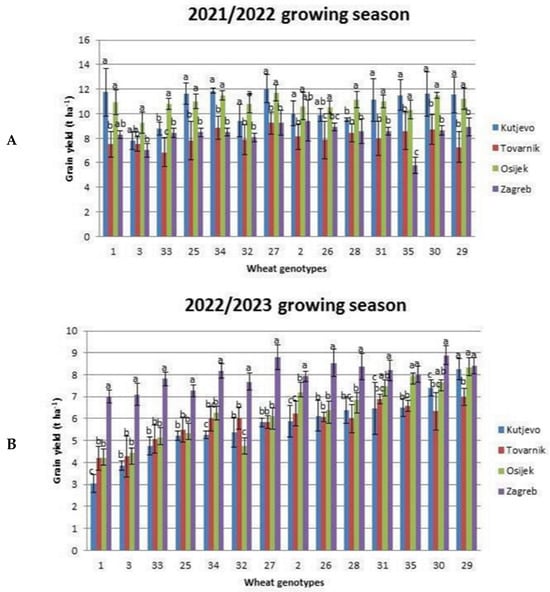 The average grain yield in Osijek and Kutjevo was at the same significance level in 2021/2022, which was significantly higher than the grain yield in Zagreb and Tovarnik (Table 3). The average test weight was significantly higher in Tovarnik, followed by the test weight in Zagreb, while in Osijek and Kutjevo, the test weight was at the same significance level. On the other hand, the average plant height was significantly lower in Tovarnik compared to the other three locations. In 2022/2023, the highest average grain yield was obtained in Zagreb, while the lowest grain yield was recorded in Tovarnik and Kutjevo (Table 3). However, the average test weight was the lowest at the location in Zagreb, as was the plant height, which had the same significance as the plant height in Tovarnik. As shown in Figure 2A,B, there seemed to be significant differences in the grain yield of each wheat genotype between the four locations, mostly reaching a significance level of α = 0.05, indicating that there existed a true yield difference. Overall, the average grain yield of the fourteen genotypes in the two years was 7.96 t ha−1, of which the average yield in the whole test in 2021/2022 was 9.47 t ha−1, and the average yield in 2022/2023 was 6.46 t ha−1.