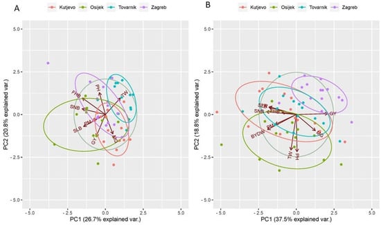 Principal component analysis (PCA) showing the relationship between grain yield (GY), test weight (TW), plant height (PH), maturity group (MG), powdery mildew (PM), septoria leaf blotch (SLB), septoria nodorum blotch (SNB), fusarium head blight (FHB), and barley yellow dwarf virus (BYDW) for 2021/2022 (A) and 2022/2023 (B) growing seasons at four locations (Kutjevo, Osijek, Tovarnik, and Zagreb) for fourteen winter wheat genotypes.
