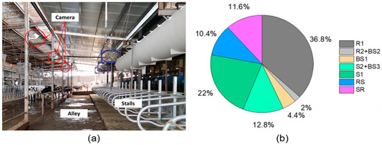 The onsite videos of cows were recorded at a commercial dairy located at Hangzhou, Zhejiang, China using six video cameras (DS-2CD3T47EWDV3-L Hikvision camera, Hangzhou, China). The resolution of the camera was 2560 × 1440 @25 fps. The positions of the cameras are illustrated in Figure 1a. The distance between camera and cow ranged from 4.2 to 5.0 m, which depended on the shooting angle and the posture of the cows. The recording period spanned from 16 to 20 August 2022. A total of 50 healthy lactating Holstein cows were housed in the test barn. A total of 250 one-minute episodes were extracted from the recorded videos, capturing diverse behaviors of the cows, which included five parts: reclining (R), standing (S), transitions from reclining to standing (RS), transitions from standing to reclining (SR), and body shaking (BS). The episode sizes for each behavior were as follows: 97 episodes for reclining posture, 87 episodes for standing posture, 26 episodes for reclining to standing, 29 episodes for standing to reclining, and 48 episodes for body shaking. It is worth noting that there was overlapping data between the group of standing and body shaking, consisting of 32 episodes, as well as between the group of reclining and body shaking, with five episodes. Such distribution of each behavior was mainly based on the time budget of cows and our rough observation. The distribution of different behaviors within the recorded episodes is concisely summarized in Figure 1b.