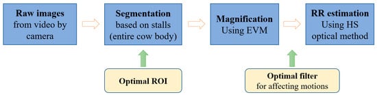 In this study, we conducted tests to assess the effectiveness of animal motion filters and Region of Interest (ROI) selection in the estimation of respiration rate (RR) using the optical flow method. Furthermore, we sought to identify optimal design parameters, specifically focusing on frame rate and video resolution. To evaluate the proposed algorithms, the absolute relative error (), and Pearson’s correlation coefficient (), and root mean square error (ε) were adopted: