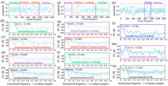 The spectral characteristics of a cow’s motions, including rising (a–e), lying down (f–j), and body shaking (k–n).
