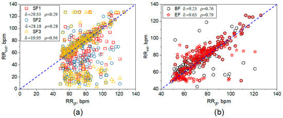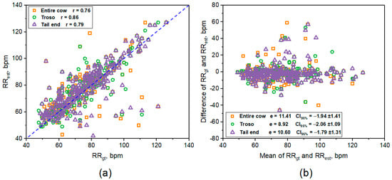 (a) Estimated RR against the ground truth (GT) values and (b) the Bland–Altman plot.