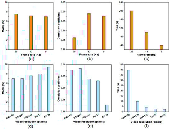 Mean absolute relative error (MARE) and the Pearson correlation coefficient of the cow respiration rate estimation as well as the computational times under different frame rates (a–c) and video resolutions (d–f).