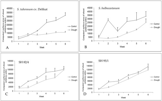 Drought stress significantly decreased the biomass accumulation of the cultivated potato cv. Delikat (Figure 2A) (ANOVA, p = 0.003), while S. bulbocastanum (Figure 2B) and somatic hybrids (Figure 2C,D) show no significant differences between control and drought-stressed plant development (ANOVA, p = 0.059). In the investigated genotypes, drought-stressed plants showed slower canopy expansion (Figure 2 and Figure 3).