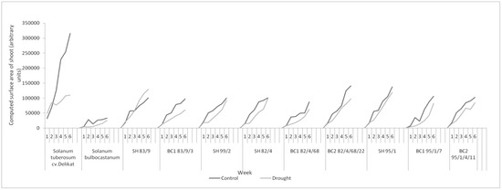 Phenotyping platforms offer a valuable opportunity to evaluate morphological and physiological changes in plants over time and under drought stress [2,37,44]. The presence of drought tolerance in some somatic hybrids supports the observation that these plants rapidly adapt to new environmental conditions. At the end of the experiment, some of them, for example, BC1 82/4/68 and BC1 95/1/7, demonstrated the ability to catch up with the control plants, not only in green biomass but also in the mean size of tubers or productivity, which is essential to breeders. These backcross progenies also carry genes Rpi-blb1, Rpi-blb3, R3a and R3b which confer resistance to late blight [18,19].