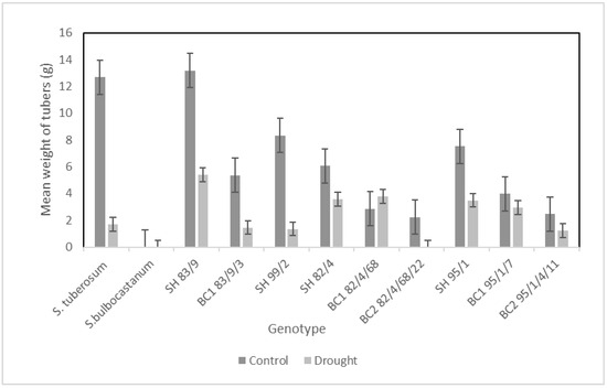 Tuber yield measurements in somatic hybrids, backcross progenies, and parental lines revealed that drought stress has significantly reduced tuber yield as compared to the control group (t-test, p = 0.0051). Although the yield is reduced, in the case of certain genotypes, the average tuber size is preserved, for example, in BC1 82/4/68 and BC1 95/1/7 (Figure 3). This is due to the different genetic background of the somatic hybrids [19]. Despite the drought stress, only a small extent of yield reduction was observed in the following genotypes: SHs 99/2 and 83/9 and BC1 83/9/3 (Figure 4).
