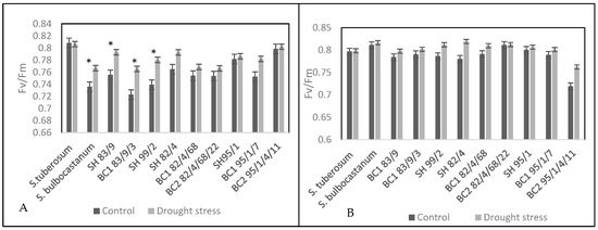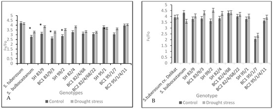 Another important parameter was the Fv/Fo, which reflects the efficiency of the water-splitting complex, which is also a sensitive component in the photosynthesis process, according to recent findings [43]. This fact is demonstrated by our results from the first measurement (2nd week), the control plants being characterized by an increased value compared to the treated group (Figure 7). Significant differences were found in four genotypes: S. bulbocastanum, SH 83/9, BC1 83/9/3, and SH 99/2, similar to the maximum quantum efficiency results (t test, p < 0.05).