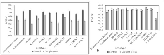 Fluorescence measurements indicated that the maximum quantum yield and effective quantum yield cannot serve as indicators of drought stress in potato and its SHs and BCs with S. bulbocastanum, as similarly demonstrated in barley [47]. As Flagella et al. (1998) [48] mentioned, mild and moderate drought stress did not significantly decrease the quantum yield of PSII, and so the Calvin cycle remains just slightly affected [49,50]. Research by Lu and Zhang [51] revealed that drought does not affect the photochemical quenching, but it increases the non-photochemical quenching, playing a crucial role in protecting photosynthesis reaction centers. The stability of the maximal quantum efficiency was also demonstrated by Lu and Zhang [52] in wheat (Triticum aestium L.) under moderately and severely drought-stressed plants. Several articles reveal that for different species, different values or intervals of maximum quantum efficiency are obtained, which are characteristic for healthy, unstressed plants [52,53,54].
