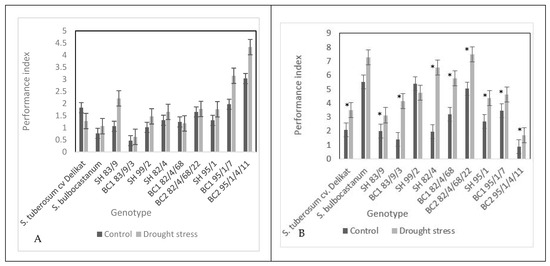 Performance index of somatic hybrids and parents in control (black columns) and drought-stressed (grey columns) plants, first (A) and second (B) measurement results the significant differences (p < 0.05) between control and stressed groups were marked with a star.
