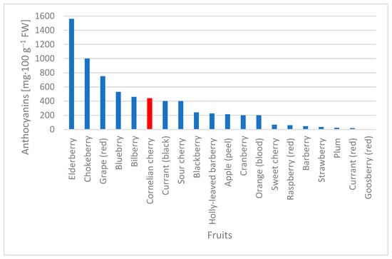 | 49.94 mg·100 g−1 FW | Fruits of cornelian cherry from the Arboretum and Institute of Physiography in Bolestraszyce, Poland. | To 5.00 g of fruit pulp, 10 mL of 805 methanol acidified with hydrochloric acid were added. | [40] |