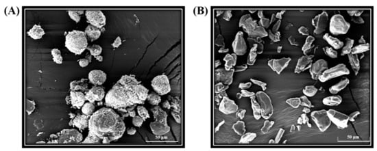 Scanning electron micrographs of polylactic acid microplastics (PLA-MPs) (A) and polystyrene microplastics (PS-MPs) (B).