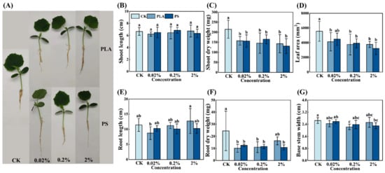 Phenotypic growth of cucumber seedlings (A), the shoot length (B), shoot dry weight (C), leaf area (D), root length (E), root dry weight (F), and base stem width (G) of cucumber seedlings exposed to microplastics (MPs). The data were all mean (n = 5) ± standard deviation. Different letters indicate a significant increase or decrease between the mean values of different treatments (p < 0.05). PLA, polylactic acid microplastics; PS, polystyrene microplastics.