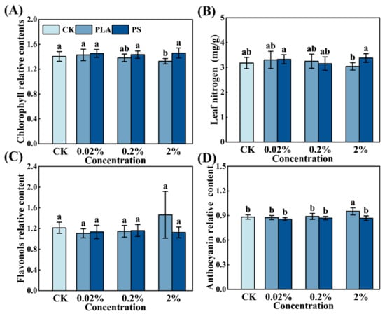 The relative contents of chlorophyll (A), leaf nitrogen (B), flavonol (C), and anthocyanin (D) in cucumber seedling leaves exposed to microplastics (MPs). The data were all mean (n = 8) ± standard deviation. Different lowercase letters represent significant (p < 0.05) difference of polylactic acid (PLA) and polystyrene (PS) microplastics.