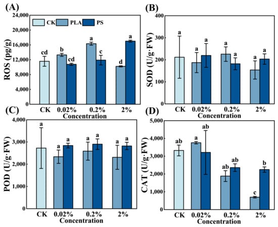 The activities of ROS and antioxidant enzyme system, i.e., SOD, POD, and CAT, in cucumber seedlings under microplastic stress. (A) reactive oxygen species (ROS); (B) superoxide dismutase (SOD); (C) peroxidase (POD); (D) catalase (CAT). Different lowercase letters represent a significant (p < 0.05) difference of polylactic acid (PLA) and polystyrene (PS) microplastics.