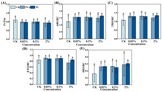 Changes in chlorophyll fluorescence parameters of cucumber seedlings exposed to microplastics. The data were all mean (n = 8) ± standard deviation. (A) Fv/Fm, maximum photochemical efficiency; (B) ABS/RC, light energy absorbed by the unit reaction center; (C) TRO/RC, energy captured by the unit reaction center for reducing QA; (D) ETO/RC, energy captured by a unit reaction center for electron transfer; (E) DIO/RC, energy dissipated in the unit reaction center. Different lowercase letters represent a significant (p < 0.05) difference of polylactic acid (PLA) and polystyrene (PS) microplastics.