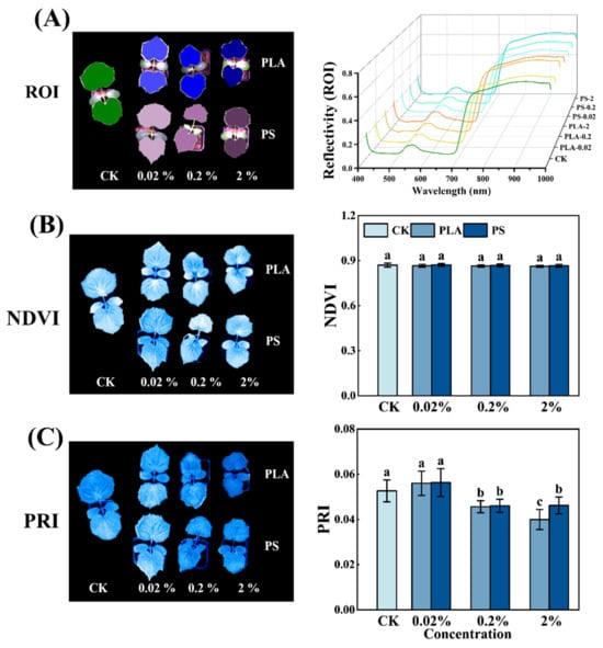 Spectral response of cucumber seedlings to microplastics exposure. (A) the spectral curve of region of interest (ROI); (B) the normalized difference vegetation index (NDVI); (C) the photochemical reflectance index (PRI); (B,C) are expressed as mean (n = 8) ± standard deviation, and the different letters indicate significant differences among the different treatments at the 0.05 level. PLA, polylactic acid microplastics; PS, polystyrene microplastics.