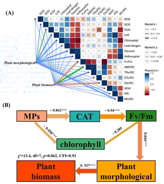 The Mantel test and Pearson correlation analysis were used to evaluate the relationship between vegetation morphology and physiological traits (Figure 7A). The results showed that Fv/Fm was negatively correlated with ROS, CAT, and other plant antioxidant indices. Pearson’s r = 0.42, p > 0.05, and Pearson’s r = 0.38, p > 0.05. It was positively correlated with plant biomass (Mantel’s r = 0.81, p < 0.01). Plant biomass had significant effects on ABS/RC and DIO/RC (Mantel’s r = 0.84, p < 0.05, and Mantel’s r = 0.87, p < 0.01). The SEM results are basically consistent with the above correlation, further determining the direct and indirect effects between the variables (Figure 7B). Our study revealed that the Bio-MPs may directly or indirectly affect changes in plant biomass through changes in photosynthesis. In addition, we found no significant correlation between NDVI vegetation index and physiological indices (p < 0.05), but MCARI was negatively correlated with chlorophyll content (Pearson’s r = −0.92, p < 0.01) and positively correlated with anthocyanins (Pearson’s r = 0.95, p < 0.01). A positive correlation was observed between PRI and CAT activity (Pearson’s r = 0.96, p < 0.05) and a positive correlation was observed between PRI and Fv/Fm (Pearson’s r = 0.41, p > 0.05). We found a significant correlation between Fv/Fm and aboveground biomass and underground biomass (p < 0.05).