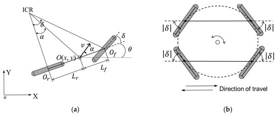 With the four-wheel steering mechanism and flexible steering control method, the robot can move on any terrain on the site with high maneuverability and avoid slipping. Common steering control methods are based on Ackerman steering principle technology [,] combined with proportional–integral–derivative (PID), fuzzy logic, and sliding mode control [,,,].