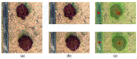 A total of 5800 images were collected in the experimental farm area of Pingtung University of Science and Technology during the autumn and winter of 2023. A multi-channel data logger (model: WatchDog 1650, Spectrum Technologies, Inc., Aurora, IL, USA) was used to record the light intensity. These images were taken through the camera on the robot platform at different times and under different weather conditions. Each image showed drip irrigation belts, field ridges, crops, unhealthy crops, or weeds. These images were then processed through image argumentation to obtain a total of 9500 images, which were used to build DetModel #1 and DetModel #2. The images were divided into a training set, test set, and validation set according to the ratio of 7:2:1. The images in the training set were manually annotated by using the open-source image annotation tool LabelImg to mark objects within the images. The abnormal growth of crops was characterized by symptoms such as wrinkled leaves, as depicted in Figure 15a,b. The type of weed at the experimental site is also shown in Figure 15c.
