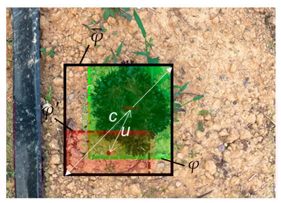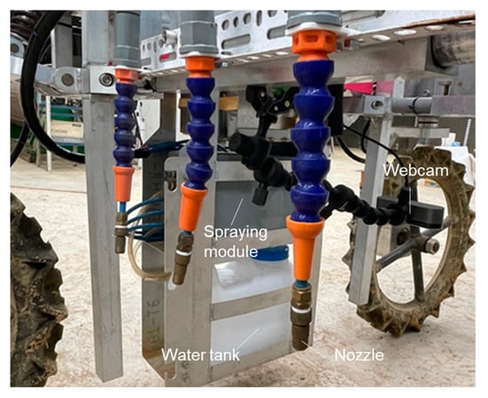 In the selective spraying experiment, water-soluble pigments were used as the spraying solution. After each spraying experiment, weeds were removed manually. About a week later, once the weeds had regrown, the spraying experiment was carried out again. Equations (16) and (17) were used to estimate the EWC and IWC, respectively. The realism of the sprayed area was determined by visually inspecting whether water dripped onto the weeds or crops. This procedure was executed in three replicates, where the total amount of solution applied in each test was quantified through a water storage bucket on the side of the robot.
